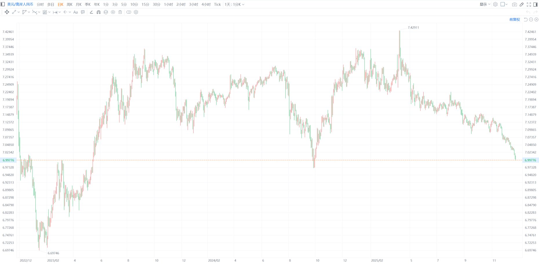 格隆汇12月25日|离岸人民币兑美元升破7.0大关,最高触及6.9976赢赢顺配资,续创2024年9月30日以来新高。